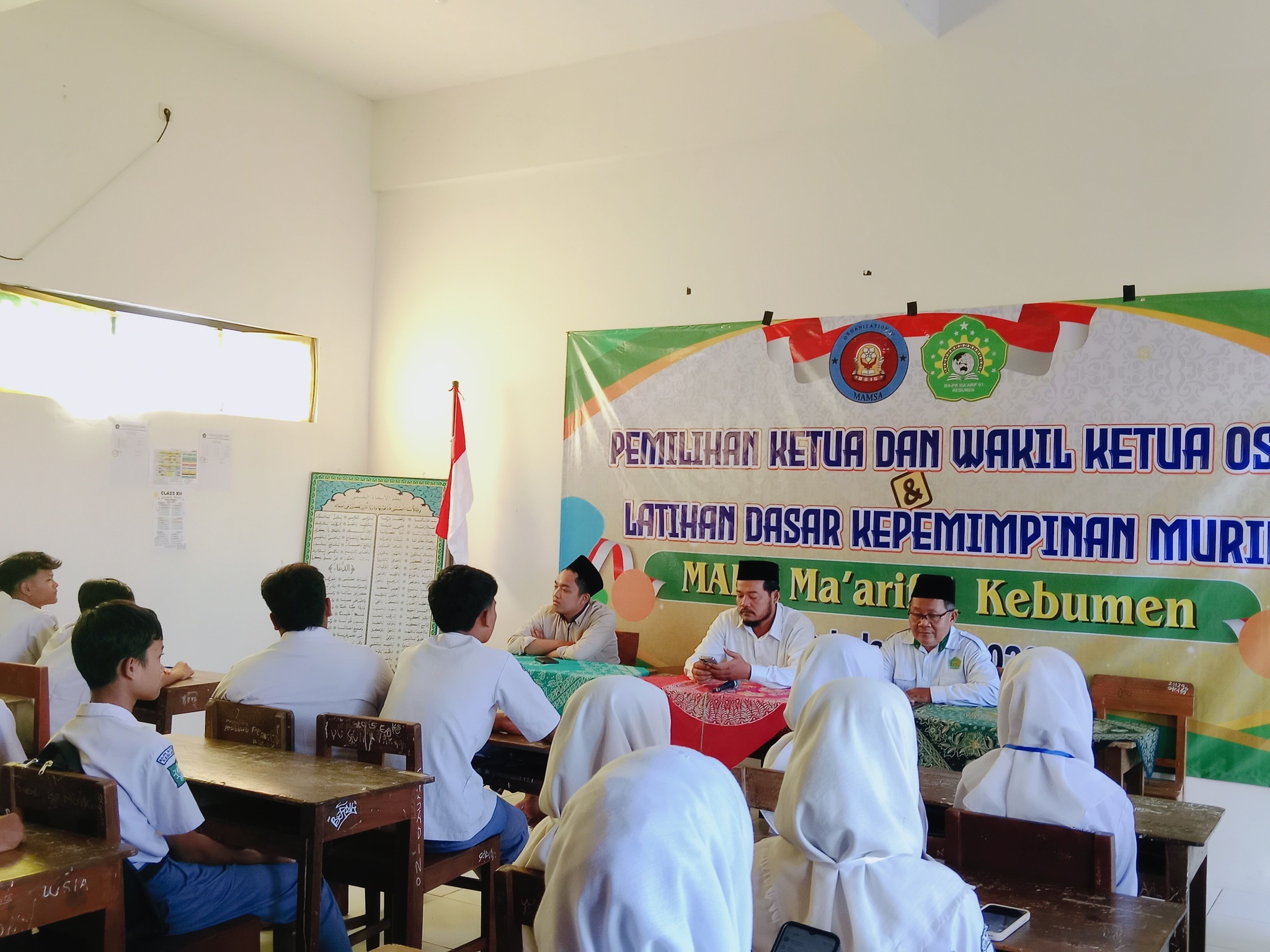 Kebumen, Selasa (23 September 2025) – Sebanyak 34 murid MA-PK Ma’arif 01 Kebumen resmi dilantik sebagai pengurus Organisasi Siswa Intra Sekolah (OSIS) periode baru setelah mengikuti kegiatan Latihan Dasar Kepemimpinan Siswa (LDKS). Kegiatan ini berlangsung dari pagi hingga sore hari dengan penuh semangat dan kekhidmatan.